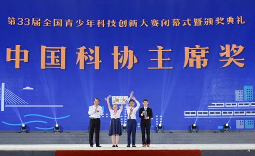 陈刚为本届大赛最高奖项“中国科协主席奖”的3名获奖者颁奖,他们分别是来自福建省泉州第五中学的林楷睿、中国人民大学附属中学的许鹤瀛、重庆市第八中学校的冯路桥。此奖项旨在鼓励热爱科学、敢于创新的优秀青少年,授予大赛中最具创新性、科学性和实用性的青少年项目。