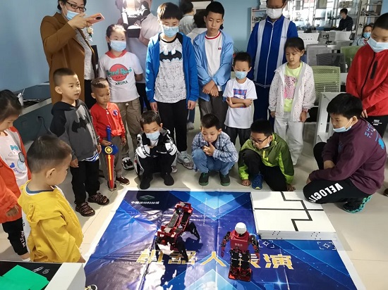 活动中,科技辅导员为学生展示了基础培训机器人、竞赛机器人以及展示机器人等几类智能机器人,这些机器人大致由控制器、传感器、执行机构、动力系统等组成,通过编写程序可以使机器人完成各种不同的任务结构,还在现场进行了多种智能机器人的操作演示。