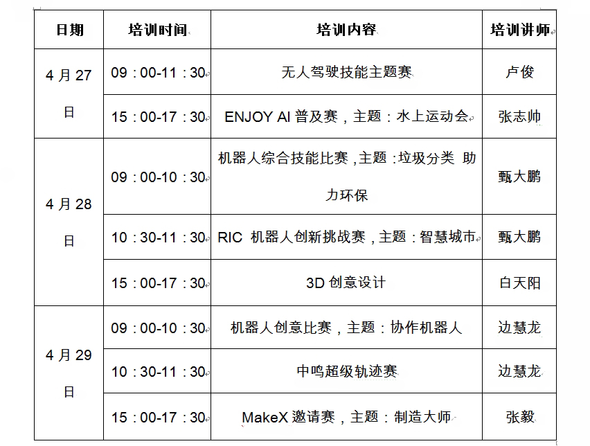 为继续推动我市青少年机器人科技活动的推广普及和健康发展,激发青少年的科学兴趣和创新热情,为全市热爱机器人科技活动的青少年提供一个发挥想象力、挑战自我、突破自我的机会,为各中小学校提供科学课程、人工智能课程等内容,定于4月27-29日联合举办第五届通辽市青少年科技辅导员培训班,5月15-16日联合举办第五届通辽市青少年机器人竞赛。现将有关事项通知如下: