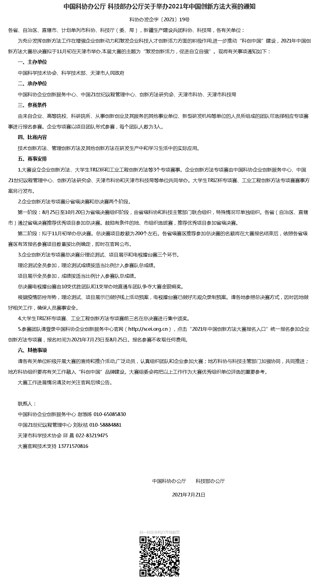 中国科协办公厅 科技部办公厅关于举办2021年中国创新方法大赛的通知