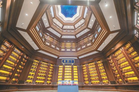 由文兴楼移步,坐落着这片建筑群的主建筑——文华堂。堂内文华厅,挑空两层、1350平方米的国家书房格外亮眼,44个巨型书柜陈列四周,抬头看是取自宋代石刻天文图的星空穹顶,3万余册具有传世价值的经典著作彰显厚重的文化底蕴。围绕国家书房,一层基本陈列“见证伟业——中华民族复兴版本展”,通过各种版本和文献资料回顾中华民族伟大复兴历史进程。二层基本陈列“斯文在兹——中华古代文明版本展”,通过13个单元分别讲述版本中的中华文明起源、政治、经济、哲学、地理、文学、史学、艺术、科技、教育、军事、民族、交流,展现中华文明源远流长。该展览汇集全国各地博物馆的“镇馆之宝”,众多国家一级文物贯穿展线。