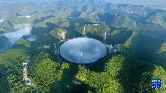 晨曦中的“中国天眼”全景(无人机照片,2022年7月25日维护保养期间拍摄)。新华社记者 欧东衢 摄