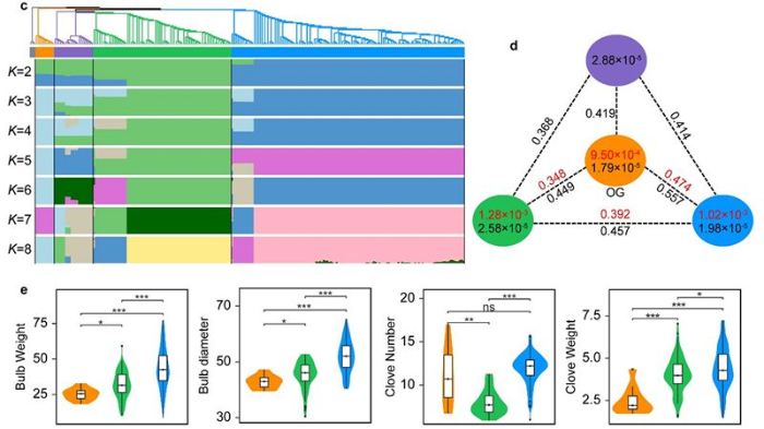 鳞茎由多个鳞芽(俗称蒜瓣)组成,鳞芽数和鳞芽重是决定鳞茎产量的关键性状,研究人员重点分析了这两个性状的选择印记,发现这些鳞芽性状候选基因要么仅在CG1中受到选择,要么仅在CG2中具有选择信号,使得鳞芽性状在两组群间分化明显,推测鳞芽性状在两个组群间的进化选择是独立进行的。