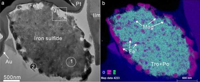 研究团队通过扫描电镜和透射电镜观察,在嫦娥五号细粒月壤中发现了约2微米直径的球形铁硫化物颗粒,其内部普遍具有溶氧的特征并含有大量的亚微米级磁铁矿和纯金属铁颗粒,而嵌入在球形铁硫化物颗粒中的铁氧化物颗粒,被确定为亚微米级的磁铁矿晶体。此外,硅酸盐的气化、氧的溶解以及磁铁矿与金属铁颗粒相的平衡析出等这些典型特征,暗示了嫦娥五号月壤中溶氧铁硫化物颗粒是月表的大型撞击事件的产物。