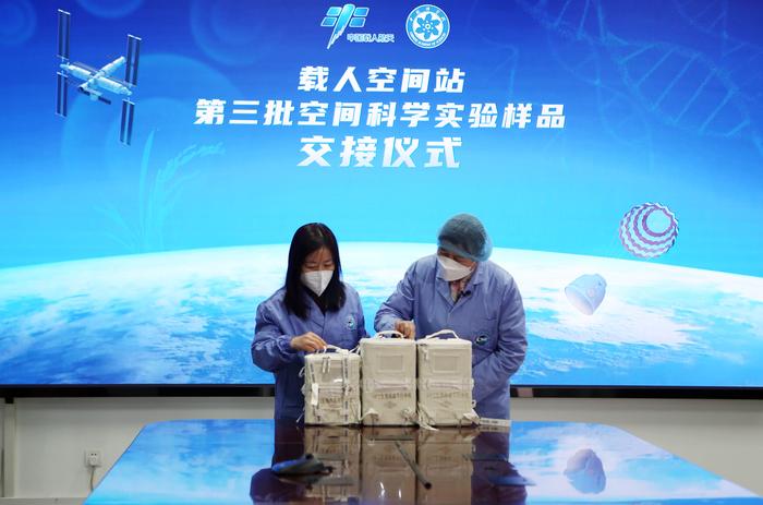 12月5日,在中国科学院空间应用中心,空间应用中心科研人员(左)向分子植物卓越中心科研人员交接样品。新华社发
