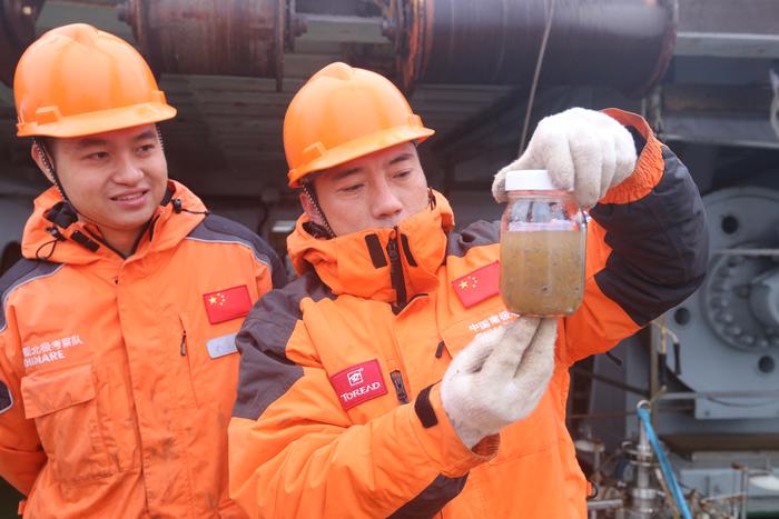 中国第八次北极考察队员观察在北冰洋海域拖网采集的表层海水微塑料样品。