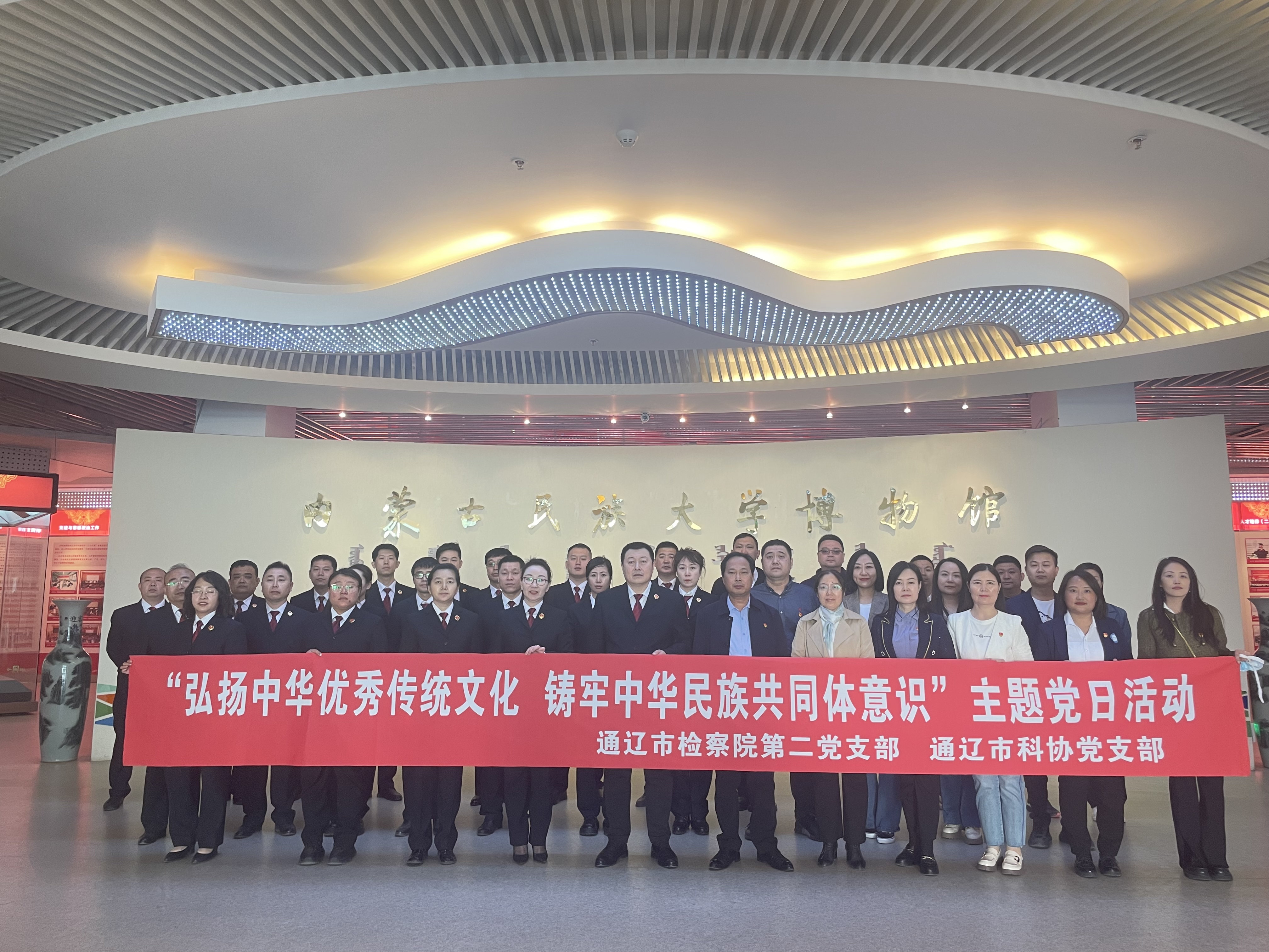 4月17日,通辽市科学技术协会党支部与通辽市检察院第二党支部走进内蒙古民族大学博物馆,联合开展“弘扬中华优秀传统文化、铸牢中华民族共同体意识”主题党日活动。通辽市科学技术协会党组成员、副主席耐日勒图,通辽市检察院党组副书记、副检察长宋志学参加了活动。
