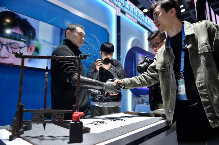 在第二届全球数字贸易博览会上,观众体验与穿戴智能仿生手的参展人员握手。新华社记者刘岭逸 摄