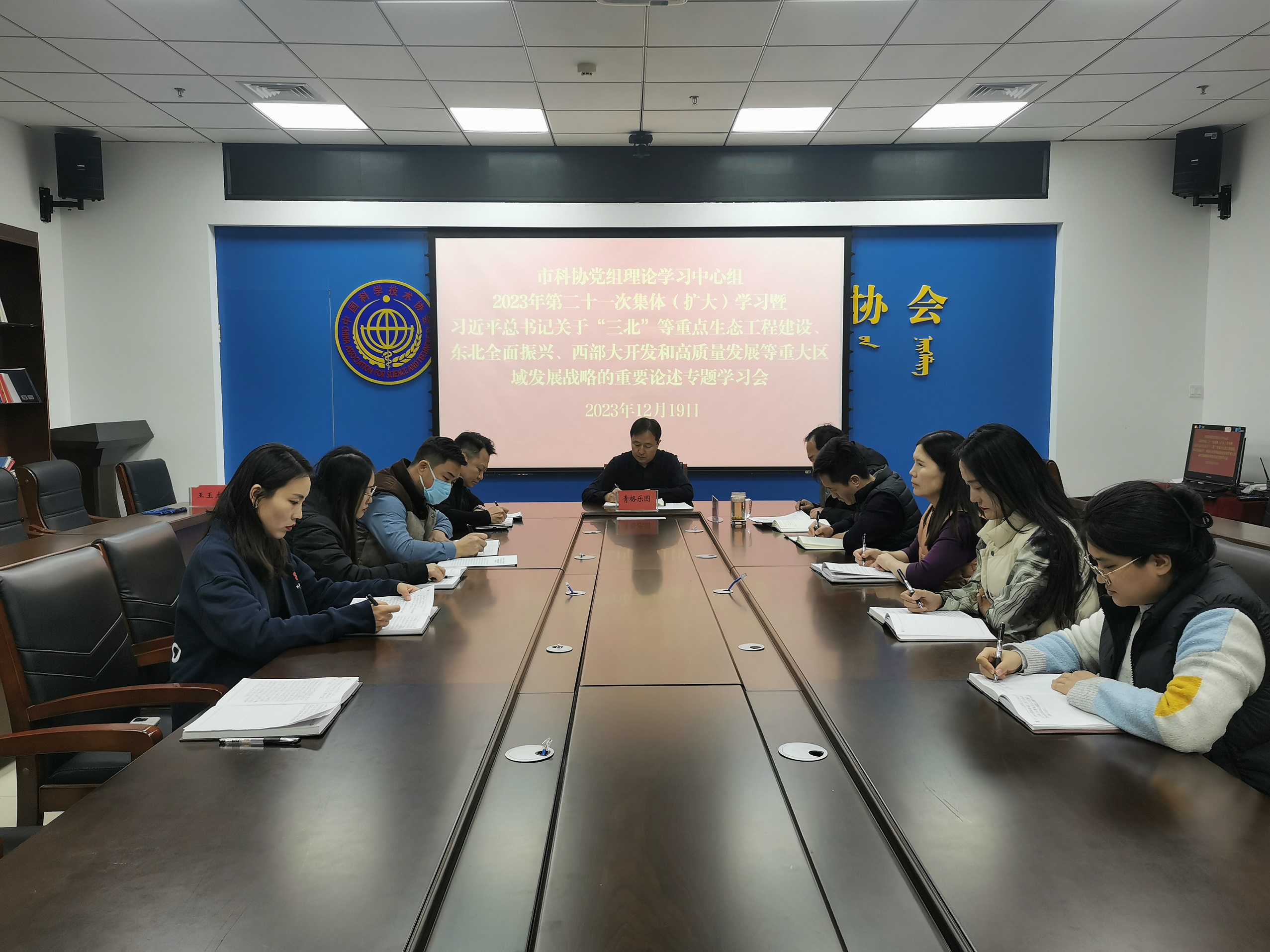 12月19日,市科协召开党组理论学习中心组2023年第二十一次集体(扩大)学习暨习近平总书记关于“三北”等重点生态工程建设、东北全面振兴、西部大开发和高质量发展等重大区域发展战略的重要论述专题学习会,机关全体党员干部参加学习。市科协党组书记、主席青格乐图主持会议。