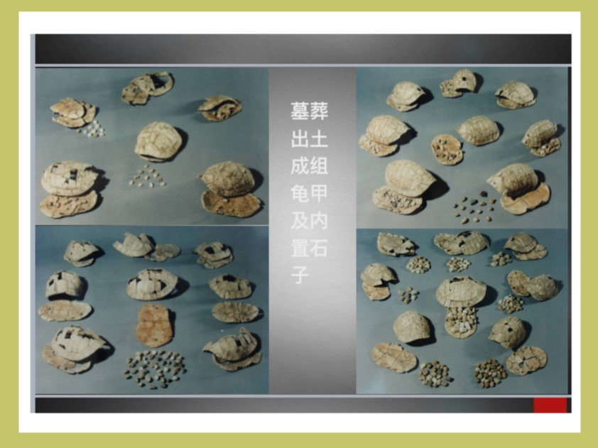 龟还用来随葬,并具有很强的规律性。大部分墓随葬8只龟,个别墓有6只龟或4只龟,都是2的倍数。这从侧面说明当时人们具有一定的数学思维,认识到了10以内的加减运算和奇偶规律。在贾湖遗址房址内的柱子洞下面,发现有埋龟和鳖的现象,可能是一种用龟和鳖奠基的行为。