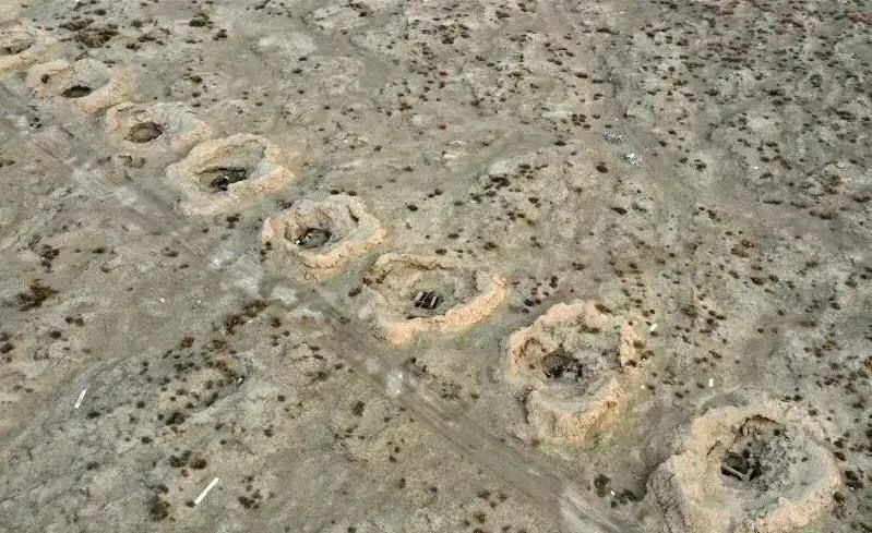 ▲吐鲁番市高昌区葡萄镇的坎儿井竖井景观。(图片来源:石榴云/新疆日报记者 蔡增乐 摄)