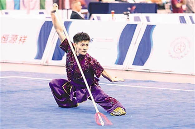 ▲在第十六届世界武术锦标赛上,中国选手张清淳在男子枪术比赛中。新华社发(田丹摄)