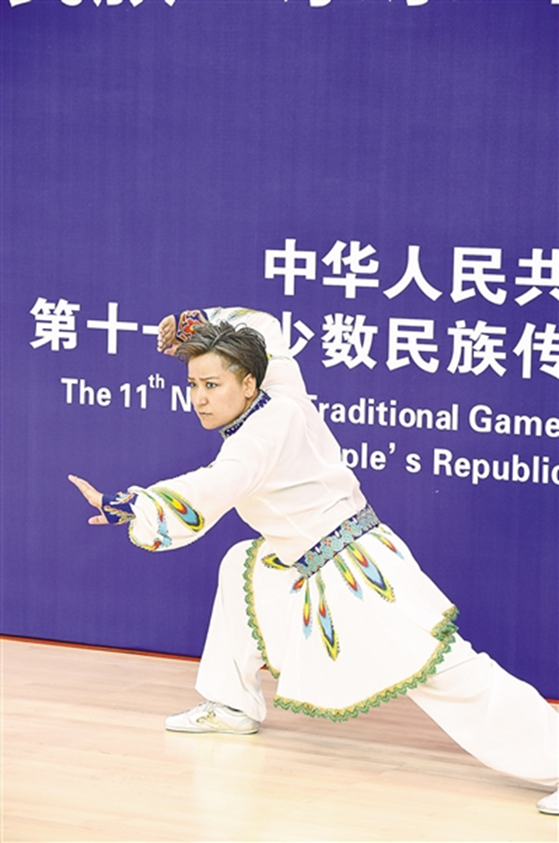 ▲在第十一届全国少数民族传统体育运动会上,新疆代表队运动员地里娜尔在民族武术项目比赛中。王京广摄