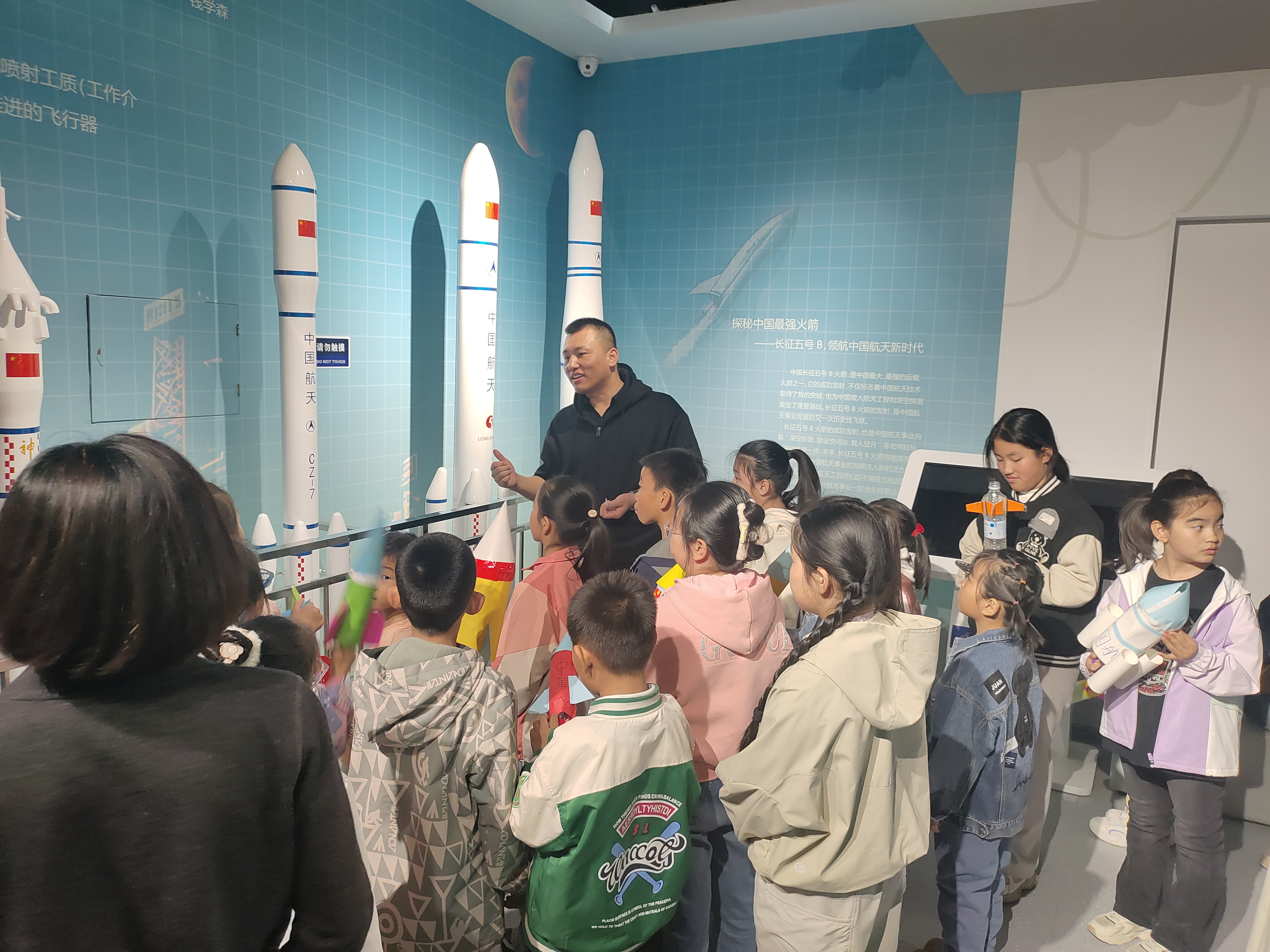 在展馆里科技辅导员带领孩子们参观火箭主题展厅,看到了长征二号F、长征七号、长征五号、长征十一号火箭模型,历经几代航天人矢志不渝的努力,终于让东方红唱响太空。长征登空,神舟发射,嫦娥飞天,天宫探秘,先进的航天技术让孩子们感受到祖国的繁荣强大!