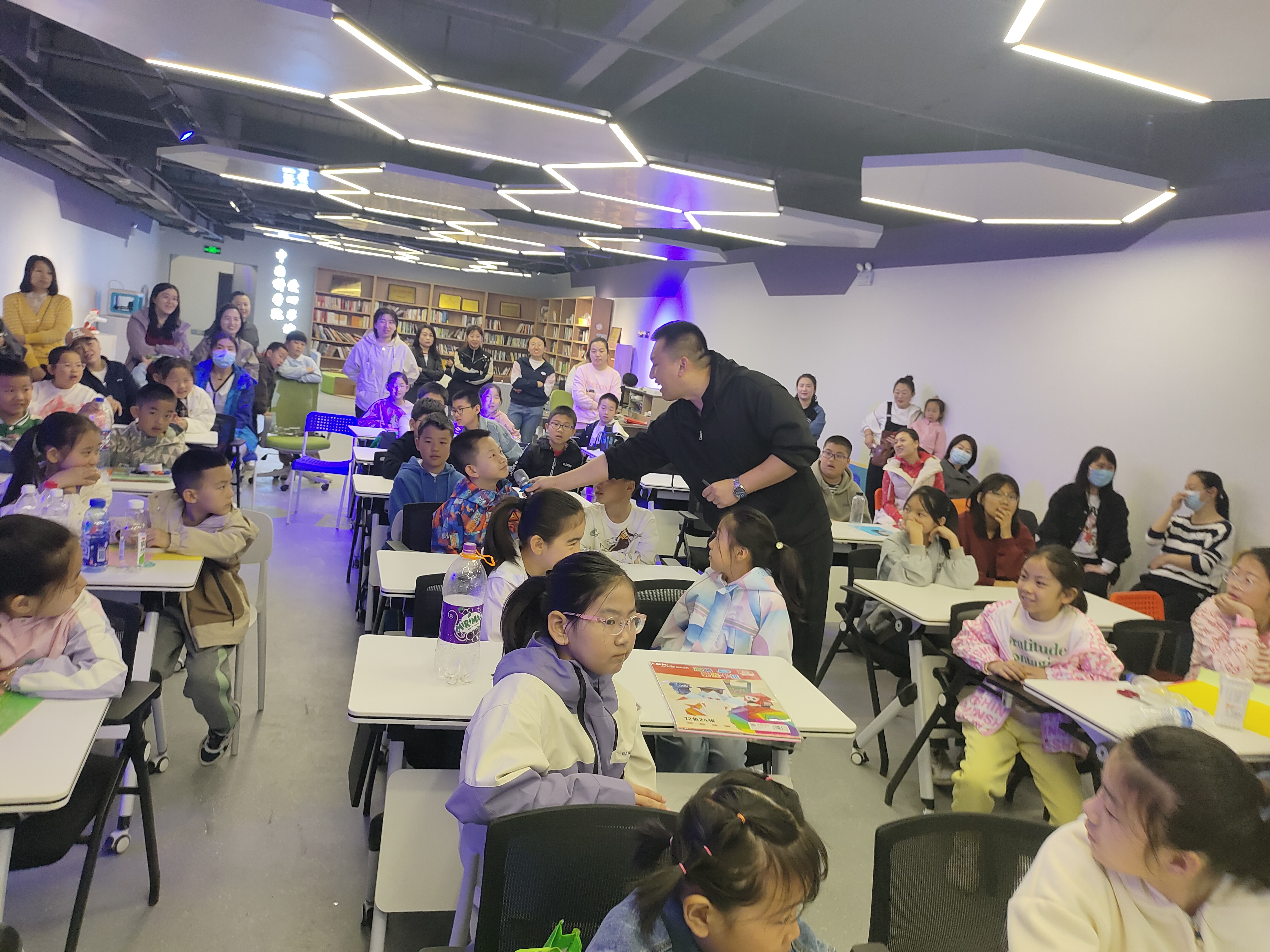 润强老师用浅显易懂的语言,生动形象的PPT,从中国航天发展史、航天日由来、钱学森介绍、长征家族运载火箭讲解、各种卫星、航天器命名以及水火箭制作原理等多个方面,为孩子们讲解了航空航天方面的基础知识。活动中为孩子们精心设计了航空航天科普讲座和互动环节。讲座通过一幅一幅生动的画面,为孩子们揭开了航空航天神秘的面纱。孩子们或专注聆听,或奋笔疾书,收获颇丰。在互动环节,孩子们纷纷举手,积极回答问题,现场气氛热烈,专家们还为同学们精心准备了小礼物。