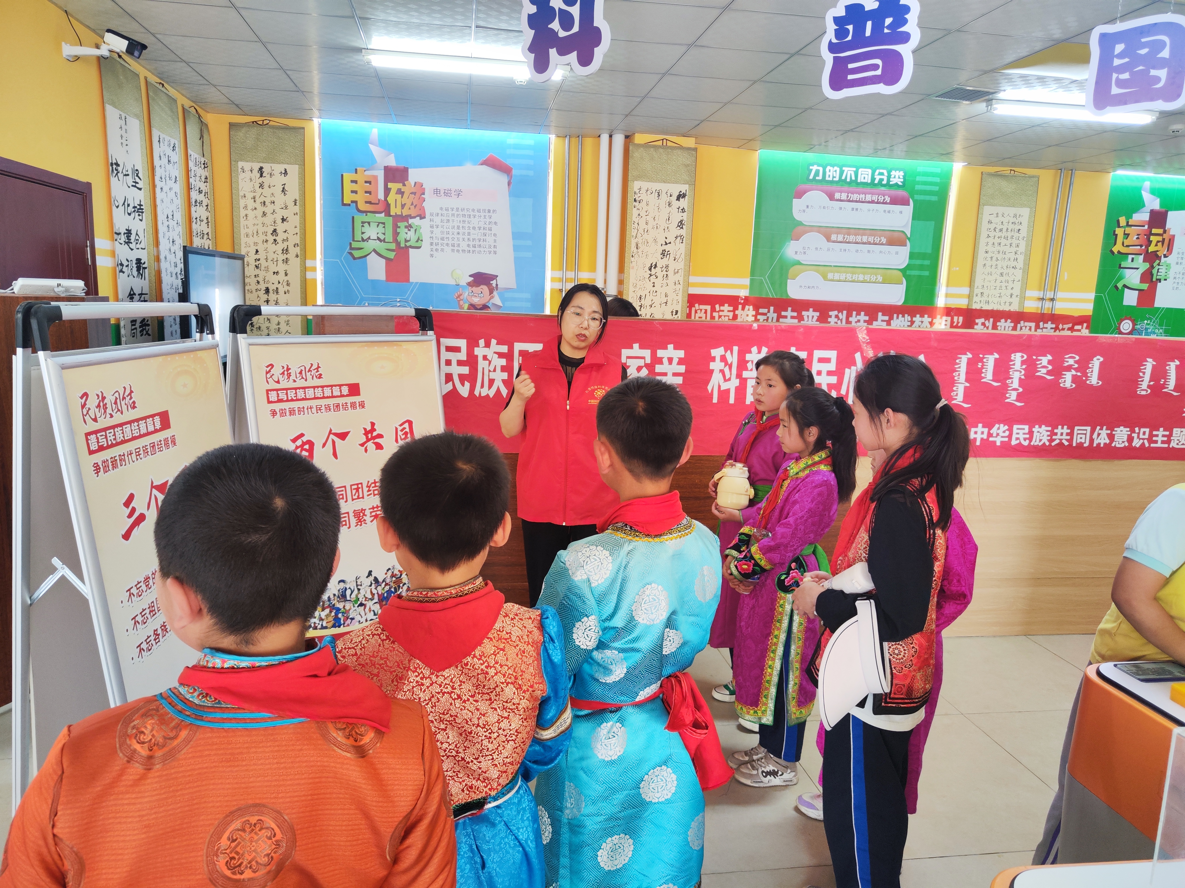 在科技馆科普图书角,学生们团团围住“民族团结”主题科普展板,聆听民族团结历史典型案例之一“昭君出塞”的故事,以及历史上一个又一个“昭君”们通过和亲牺牲“小我”的幸福为国家和平和民族团结之“大义”所付出的努力,工作人员在讲述中,将昭君为草原人民带来的科学技术人才、引进的各行业专业技术、传播的各行业文化以及中原和塞外的特产和物资物质交流等情节做了重点提及,让孩子们认识到,这些古代“弱质女子”之所以能够青史留名,是因为这些杰出人物为民族团结和和平统一所做的贡献。工作人员还提到了近代的英雄人物草原小姐妹为了保护人民的财产所做出的奉献、草原额吉都贵玛为孤儿们付出的爱心,让孩子们明白不论什么年代信仰都是无比的重要,也明白民族团结不只停留在口头上说,更需要脚踏实地的去做。