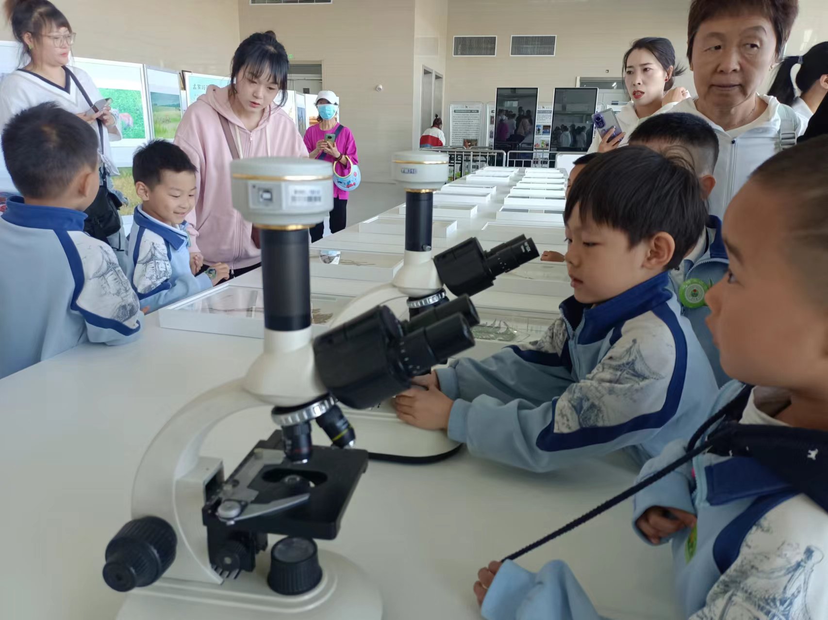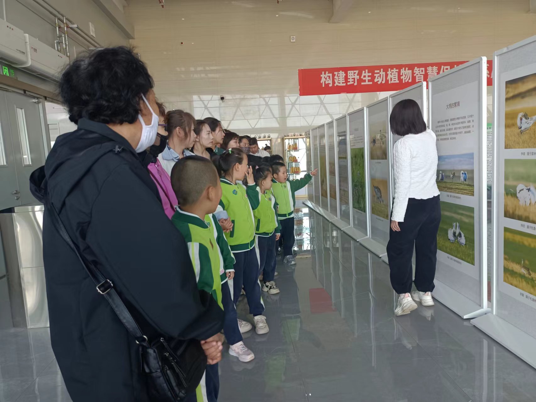小朋友们在老师和家长的陪同下,分为5组,有序进入展厅。在科技辅导员的带领下,通过各种珍稀动植物标本、模型及互动体验设备,使孩子们深入了解通辽地区丰富的自然资源和独特的地理环境。科技辅导员为小朋友们带来了生动有趣的讲解,共同探索自然的奥秘。大鸨鸟、马鹿、天鹅等国家重点保护珍稀动物展板,详细描述了在通辽地区的分布、动物习性;植物标本区,形态各异的植物标本映入眼帘。科技辅导员向小朋友们介绍了各种植物的特点和生长环境,了解了生态系统、物种之间的关系、人类活动对环境的影响,感受到大自然的神奇和美丽的同时,意识到保护生态环境的重要性。