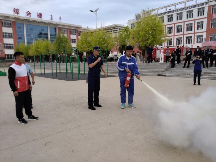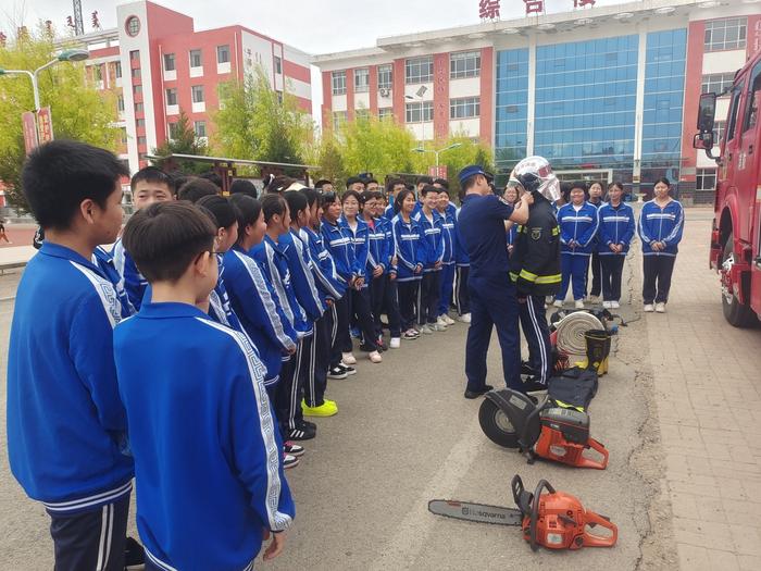 随后深入库伦旗第四中学,组织学生进行应急演练,通过模拟演练的方式帮助师生们掌握火场逃生自救技能。消防员为师生们现场讲解了灭火器的使用方式与注意事项,让师生们亲身体验使用灭火器灭火。并将消防车上的各类器材向师生们进行了展示,深入浅出地介绍了消防车上各式各样的器材和个人防护装备,让同学们体验当一回“消防员”。活动中共发放《身边科学知识手册(安全知音篇)》《防灾减灾宣传手册》《应急管理常识家庭应急篇》等宣传资料500余份。