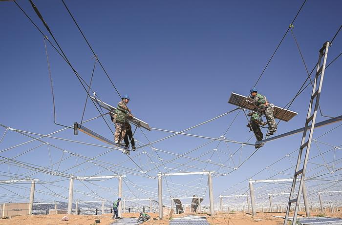 位于内蒙古杭锦旗库布其沙漠亿利生态示范区的蒙西基地库布其200万千瓦光伏治沙项目,目前进入光伏板安装环节。该项目预计2024年底前实现全容量并网发电,建成后年平均可供应绿色电力约40亿千瓦时。图为工人在光伏治沙项目现场施工。新华社记者 刘磊 摄