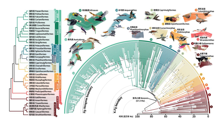 早期新鸟类经历的快速辐射性演化事件诞生了现生鸟类数十个主要类群,但辐射性演化发生时间却一直备受争论。之前的分子生物学研究可以推定这一事件发生在白垩纪末期那次大灭绝事件附近,但不能判定是在大灭绝之前还是之后。