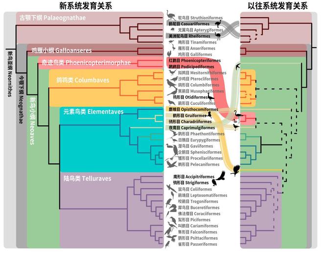 在过去100多年里,鸟类系统分类学的研究人员通过不同数据类型,例如,形态学数据、线粒体数据、少量蛋白质编码基因序列数据和鸟类物种基因组数据等等,对新鸟小纲主要类群之间的系统发育关系,提出了各种各样的观点,也产生了许多争议。这也使得新鸟小纲内部的演化关系,成为鸟类系统发育尚未厘清的重要问题之一。