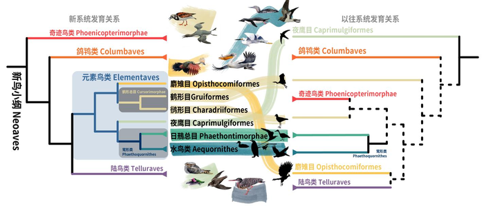 第四大分支是元素鸟类,也是这次研究提出的全新类群,这个命名源自拉丁语中的“elementum”(元素)和“aves”(鸟)。它既包括了主要在水域活动的企鹅、潜鸟、信天翁等鹭形类、鹤形类鸟类,也包括了主要在陆地活动的麝雉等,还有更擅长在天空活动的夜鹰和雨燕等夜鹰目鸟类。由于对应水、土和气三种古典元素,因此得名。