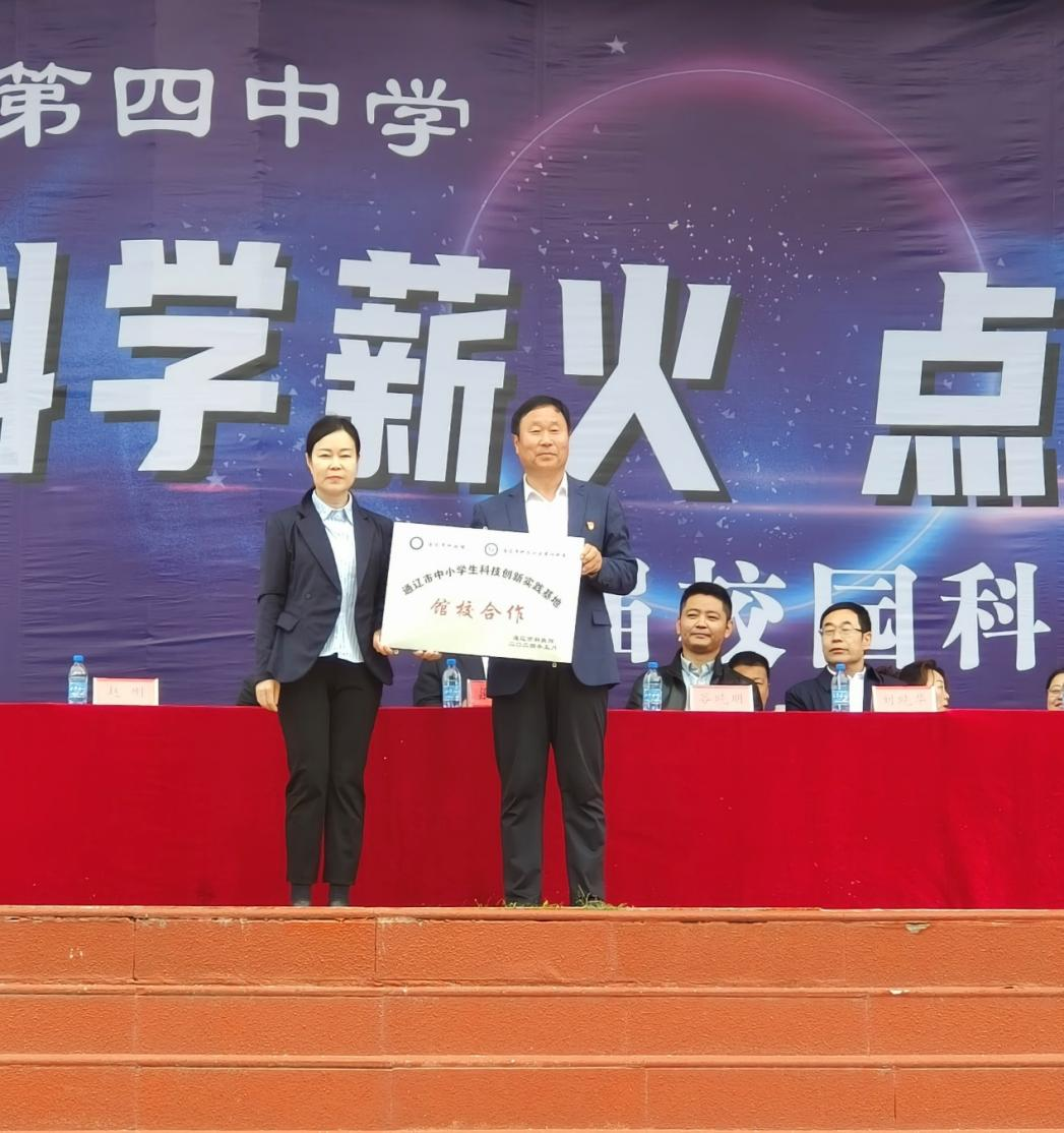 5月30日,在第八个“全国科技工作者日”来临之际,通辽市科技馆助力通辽四中开展了以“传承科学薪火,点亮创新之光”为主题的第六届校园科技节。通辽市科技馆馆长于伟丽,科尔沁区科协主席刘晓华,通辽四中校长宋兆起出席本次校园科技节启动仪式。于伟丽馆长在校园科技节启动仪式上代表市科技馆向通辽四中第六届科技节启动仪式的隆重举行表示热烈的祝贺。她指出,科技馆以学校需求为导向,积极开展“馆校双进”丰富多彩的科技教育活动,用科技馆特色的教育方式融入学校科学教育,共同搭建起科普资源的共建共享平台。此次活动是“馆校合作”的一次有力实践,希望以此建立起更加亲密、更加广泛的长期联系机制,共同探索学校教育与校外科技教育联合培养创新人才的有效模式。启动仪式上,通辽市科技馆授予通辽四中馆校合作“通辽市中小学生科技创新实践基地”牌匾,此次授牌标志着教育资源与科普资源的深度融合,开启双方在科学教育领域深入合作的新篇章。
