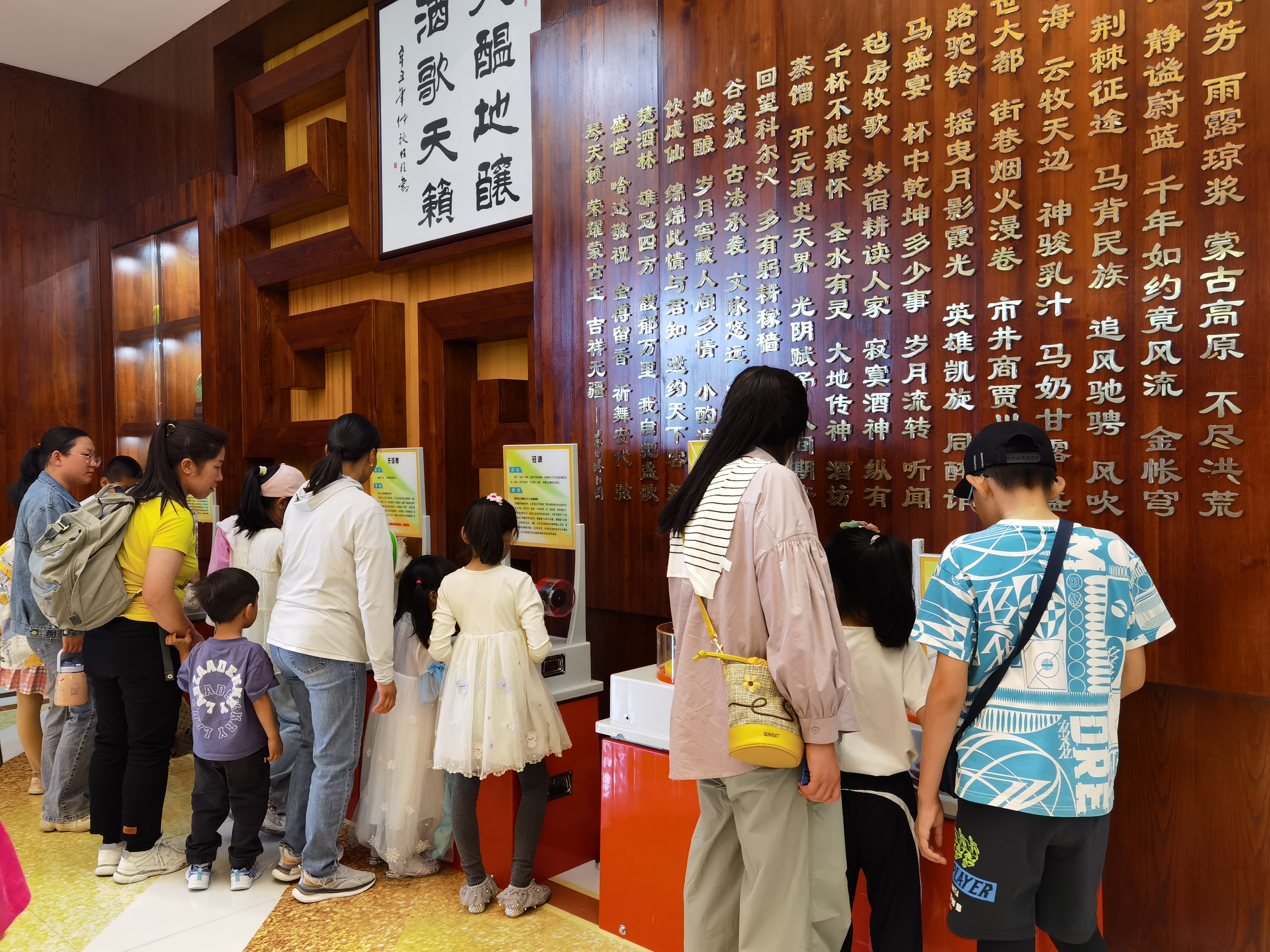 学生和家长们先后参观了酿酒车间、陶坛库、制酒车间、蒙古王文化馆,科普人员为学生们讲解了各种酿酒设备的用途和工作原理,介绍了人类酿酒历史、制酒原料的选择配比及其状态的改变、环境因素的控制等。通过这种近距离“看、听、问、学”的方式了解制酒过程中包含着诸多工序,中间发生许多复杂的物理、化学变化,让学生们在轻松愉快的氛围中学习到很多课本里学不到的科学知识,激发了他们对科学的兴趣。随后,科普大篷车给学生们带来了“虚拟现实体验”“探视无穷”“小球运动”等十几种展品,涵盖光学、电学、力学、材料学、物理学等多方面的科学原理。学生们纷纷聚集在展台周围,通过“玩、摸、试、思”等形式亲身感悟科技带来的快乐,在益智展品中学习科学知识,在欢乐氛围中领略科技的魅力。期间,工作人员还为孩子们发放书包、文具100余套,青少年科普知识、青少年素质提升行动读本200余册,为一线产业工人发放民族团结进步宣传资料、社会主义核心价值观、心理健康科普知识、产业工人科学素质提升行动读本400余册(份)。