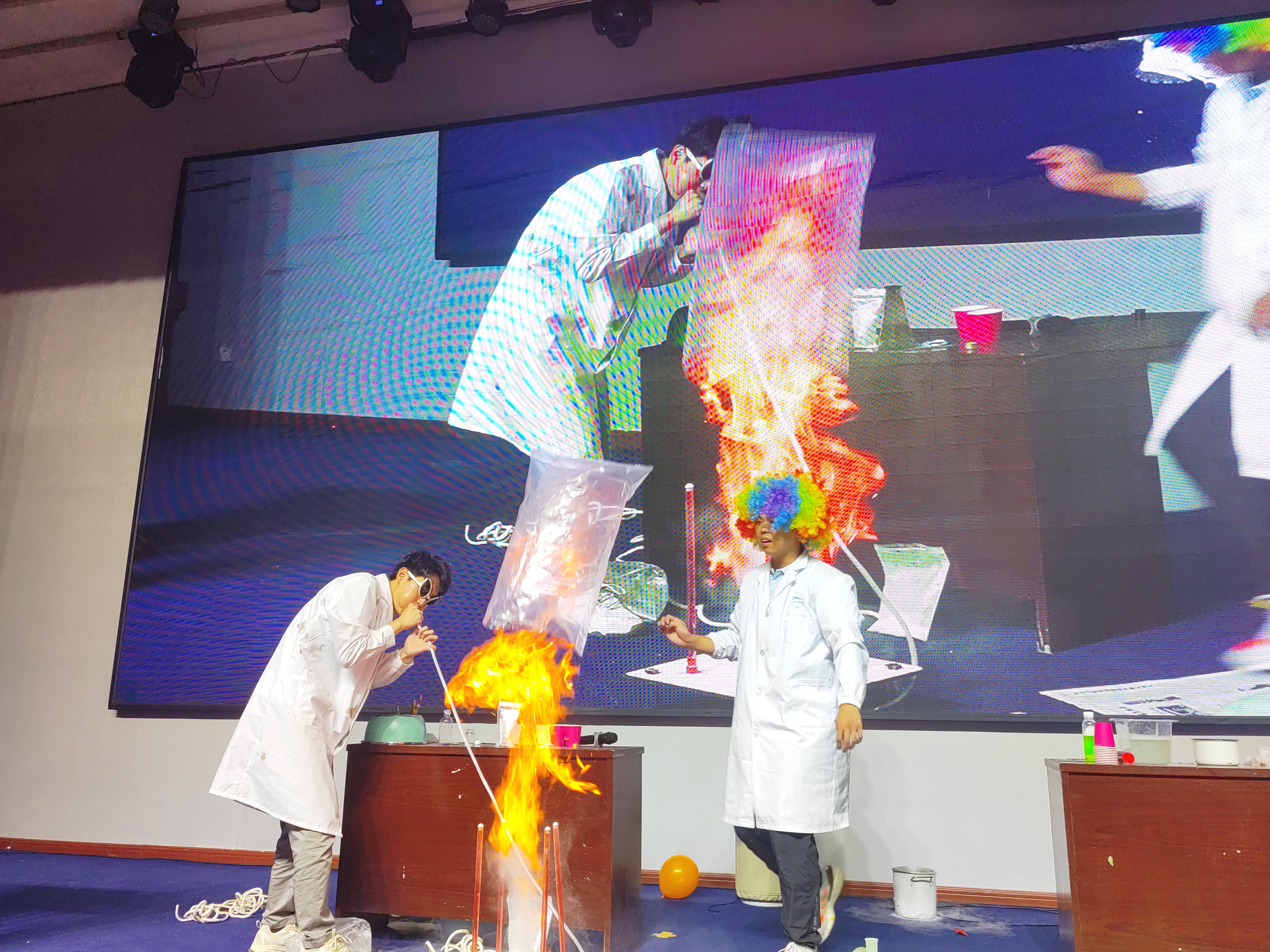 闭幕式上,播放科技节期间的活动视频展示了科普大篷车、四足机器人等科普展品为同学们带来的直观的科技体验。随后,科技辅导员们的科学表演秀,用趣味横生的方式将科学现象娓娓道来,揭开科学的神秘面纱。两个半球吸附无法分开、空气炮击倒目标、独门绝学“火焰掌”……这些神奇的现象让同学们惊叹不已,也激发了他们对科学探索的浓厚兴趣。