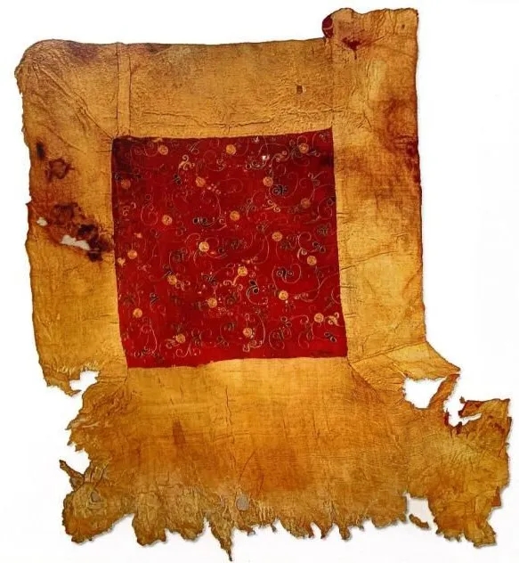 ▲甘肃花海毕家滩26号墓中出土的一件绯罗绣裲裆。