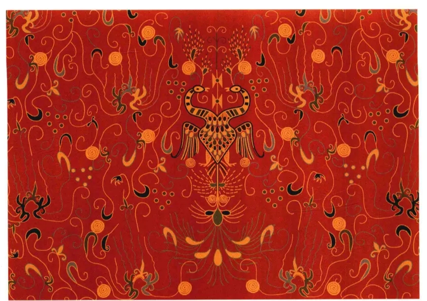 ▲新疆吐鲁番阿斯塔那东晋十六国墓葬出土的裲裆实物残片,绣有双头同体鸟纹样。