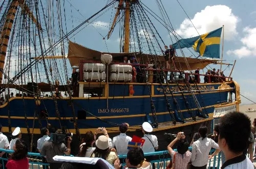 ▲2006年7月18日,瑞典仿古商船“哥德堡”号经过9个半月的艰苦航行,终于来到了广州南沙港。这是瑞典商船与广州时隔261年的重逢。1743年至1745年,“哥德堡”号在中瑞之间来往了3次,掀开了中瑞经贸关系的第一页。(图片来源:新华社)
