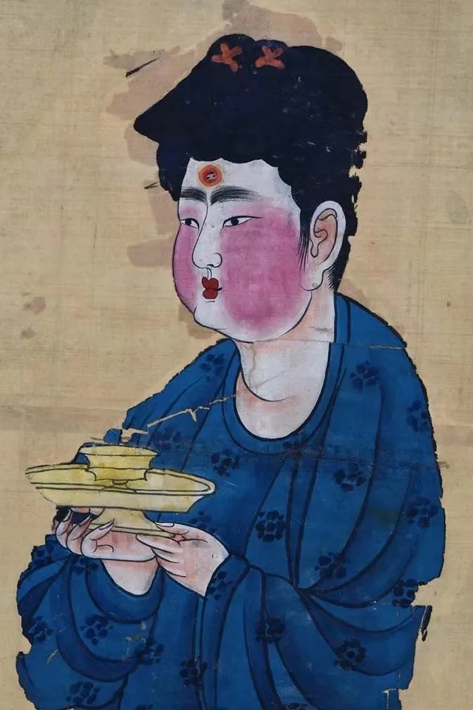 ▲唐代绢画《弈棋仕女图》局部之《托盏侍女图》。该画出土于新疆吐鲁番的阿斯塔那187号墓。仕女手持盏托和盏,为对弈的主人进茶,反映出唐代饮茶已风行西域地区。(图片来源:新疆维吾尔自治区博物馆)