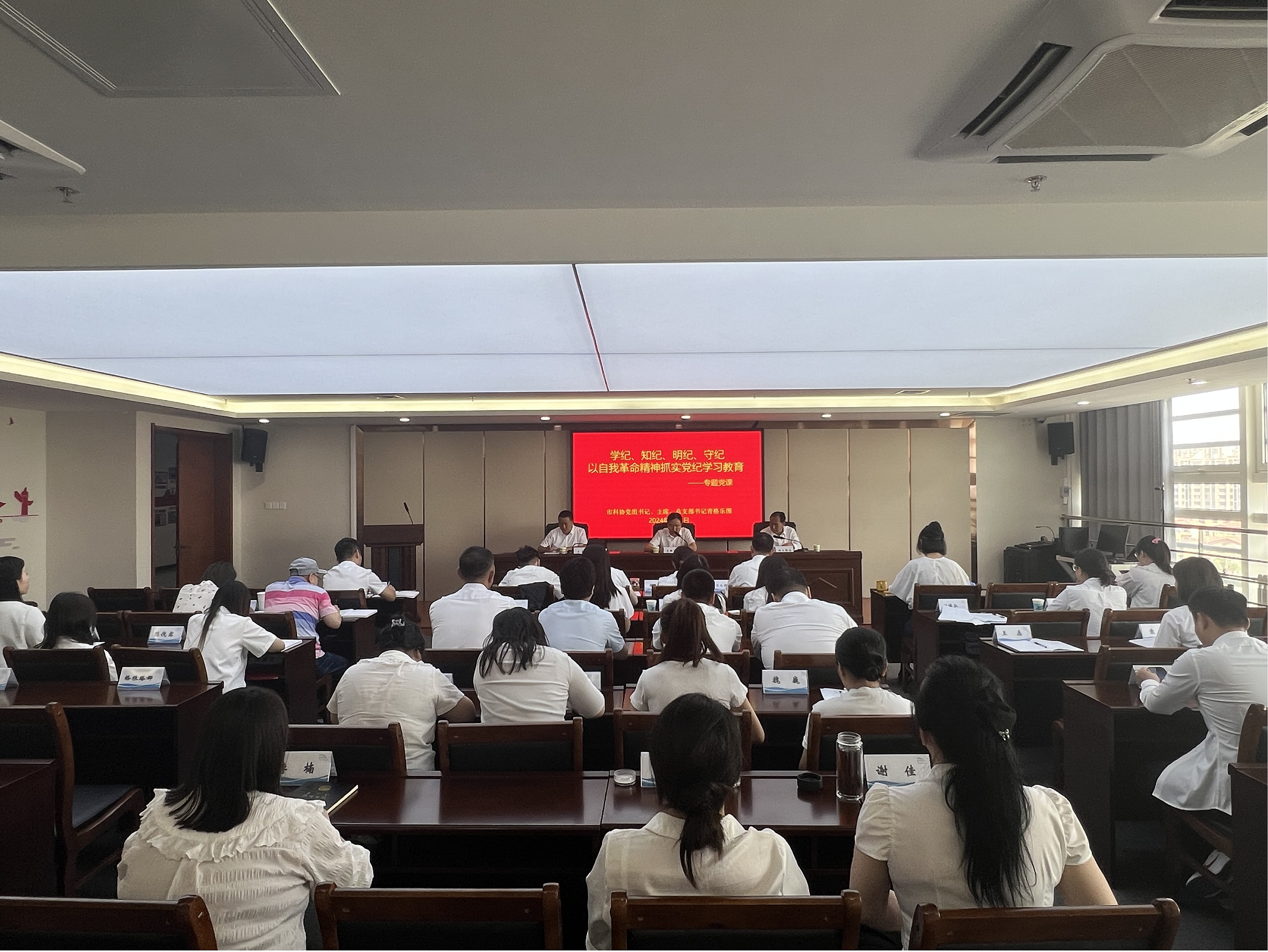 7月1日上午,市科协党组书记、主席、党总支部书记青格乐图以《学纪、知纪、明纪、守纪 以自我革命精神抓实党纪学习教育》为题,围绕习近平总书记关于全面加强党的纪律建设的重要论述,《中国共产党纪律处分条例》,学纪、知纪、明纪、守纪等内容为全体党员、干部讲授党纪学习教育专题党课。党课结合科协工作实际,强化以案说纪,结合通辽市近几年发生的违纪违法案件,用身边事教育身边人,用身边发生的鲜活典型案例,给市直科协系统党员、干部敲响了拒腐防变的警钟,教育引导党员、干部把遵规守纪刻印在心,内化为言行准则,以严明的政治纪律和政治规矩,带动各项工作全面从严,坚决做到学习党纪、敬畏党纪、遵守党纪,做到心有所畏、言有所戒、行有所止,确保党的纪律在市直科协系统得到严格执行。