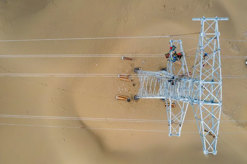 ▲在新疆和田地区塔克拉玛干沙漠中,电力工人在一处铁塔上进行高空作业。(图片来源:新华社记者 胡虎虎)