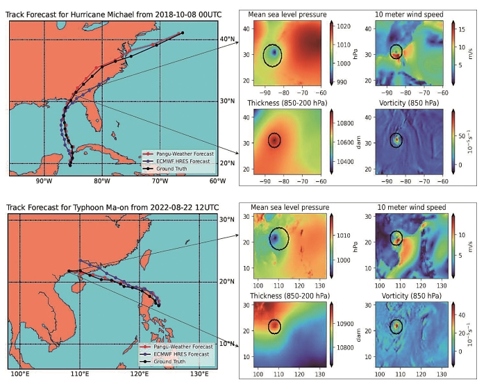 图为盘古气象大模型预报台风路径原理。上半部分为飓风迈克尔的路径预报结果,下半部分为台风马鞍的路径预报结果。(作者供图)