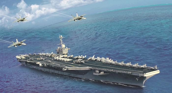 美国以“艾森豪威尔”号航母为中心组建了第二航母打击群。它通常由7-11艘巡洋舰、驱逐舰、攻击型核潜艇和补给舰构成,战时根据需要也会相应调整、增加舰艇数量。舰载机与这些舰艇共同构建了一个大纵深、多层次、火力强大的攻防体系。