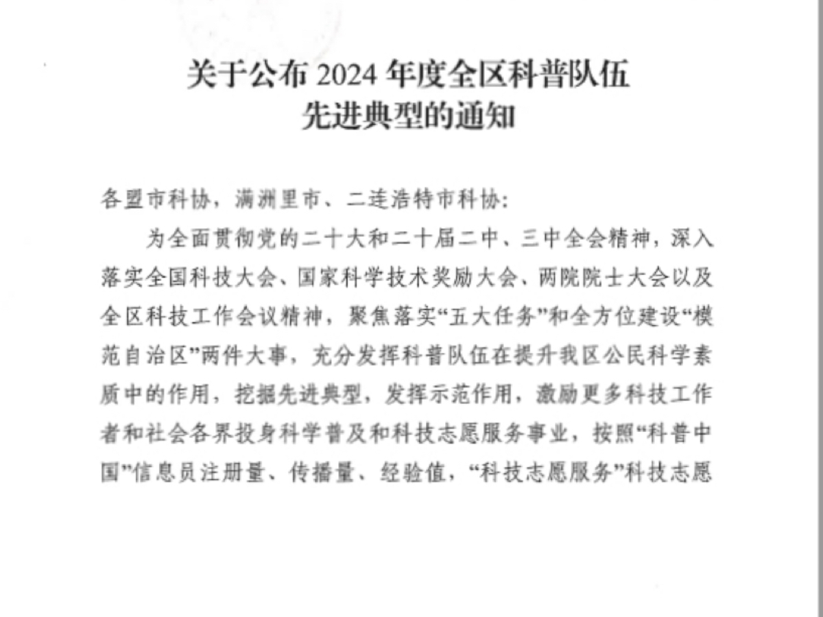 近日,内蒙古自治区科协发布《关于公布2024年度全区科普队伍先进典型的通知》,开鲁县科协获评“2024年度全区科普队伍先进典型——优秀组织单位”,开鲁县保安农场科普信息员蒋加文、马清艳和开鲁镇科普信息员吴云海、李春华被评为“优秀科普信息员”;开鲁县中等职业技术学校田宏智荣获“优秀科技志愿者”称号。