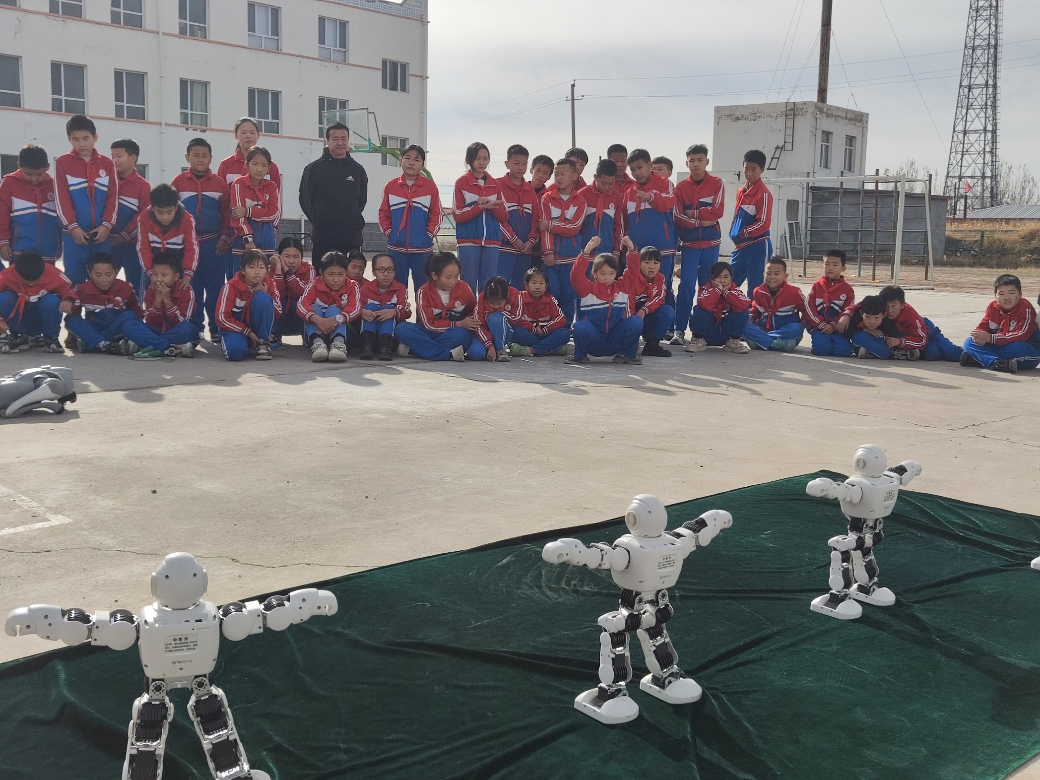 20余件车载展品,在操场亮相,群舞机器人在台布上摆放,机器狗在展区中心静静伏卧,孩子们围成个大半圆,包括小学、幼儿园师生在内的200余人现场参观体验,听校方主持人讲本次巡展的意义,抢答科技馆负责人提出的民族团结进步小知识,看两级科技馆人工智能机器人现场展演,体验与车载展品互动的惊喜与新奇。许多孩子在群舞机器人做广播体操的时候,都不知不觉的伸伸胳膊伸伸腿,跟着机器人一起做了起来。机器狗的表演一如以往在其他学校展示时一样,赢得了孩子们的欢呼,用老师们的话说“这下子可真的炸了”。