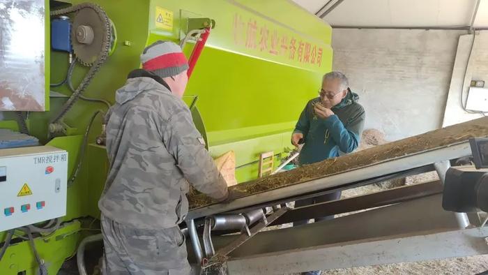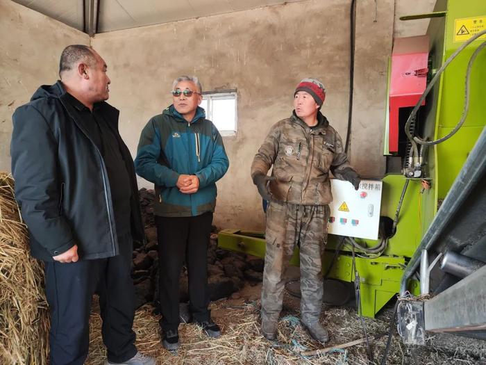 嘎查书记图日根白乙拉带领科普服务队走访了当地利用地面农膜覆盖技术制作青贮饲料的舍饲养殖户,查看了未启用的饲料外覆农膜完好程度,了解当下已经开始饲喂制作好的饲料的使用方法。特老师了解了牧户家庭养殖中是否存在无法解决的情况,并给养殖户现场解答疑难问题。在查看了牧民家里全日粮(TMR)机械制作的“车间”后,对于混合饲喂配比情况做了些调整提示;对牧民家刚生完小牛犊的母牛的产后护理也提出了一些合理的用药建议,对于养殖棚舍里的发现的一些不容忽视的问题也做了适当的提醒。